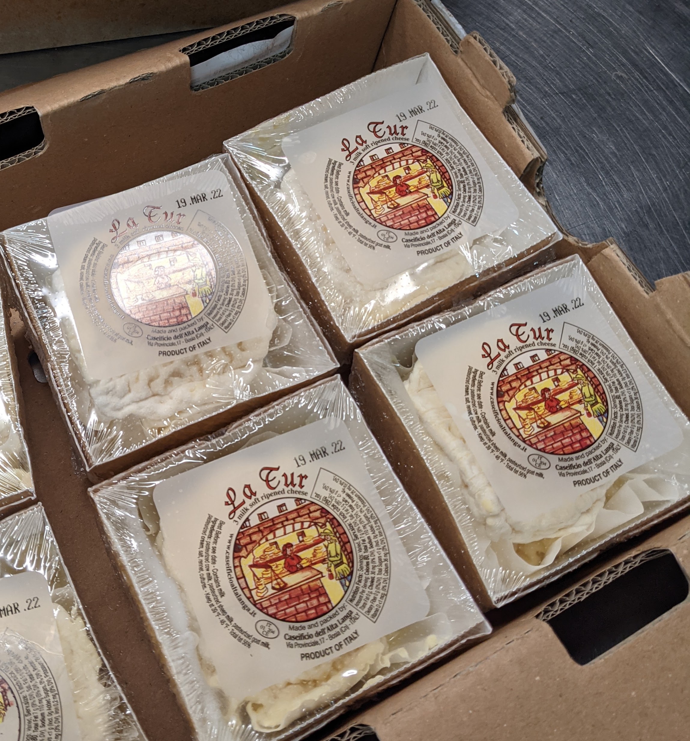 La Tur is a soft-ripened cheese made from a blend of sheep’s, cow’s and goat’s milk. It is produced by Caseficio dell’Alta Langa in the Alta Lange region of Italy. The cylinder shaped cheese is a light straw yellow colour with an edible soft and wrinkled rind. La Tur tastes of the sweetness of cream and butter, followed by acidic notes and yeasty flavors.
